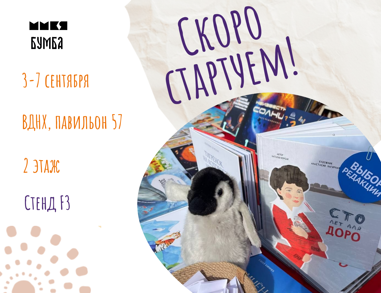 С 3 по 7 сентября в павильоне №57 на ВДНХ распахнёт двери Московская международная книжная ярмарка — важнейшее событие для всех, кто ценит силу слова и радость чтения. Издательство «Бумба» приглашает родителей и детей от трёх до пятнадцати лет заглянуть на стенд F3 на втором этаже, чтобы вместе открыть новые книжные миры и укрепить традицию совместного чтения.